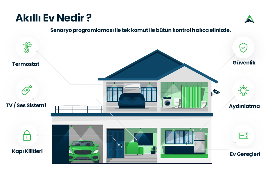 Evlerinizi geleceğe taşıyoruz: Akıllı aydınlatma ve perde/panjur kontrolü İklimlendirme (termal konfor, otomatik ısıtma/soğutma) Güvenlik sistemleri (kamera, alarm, kapı kilitleri) Eğlence sistemleri (multi-room ses, akıllı TV entegrasyonu) Enerji yönetimi ve tasarruf otomasyonu